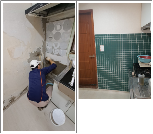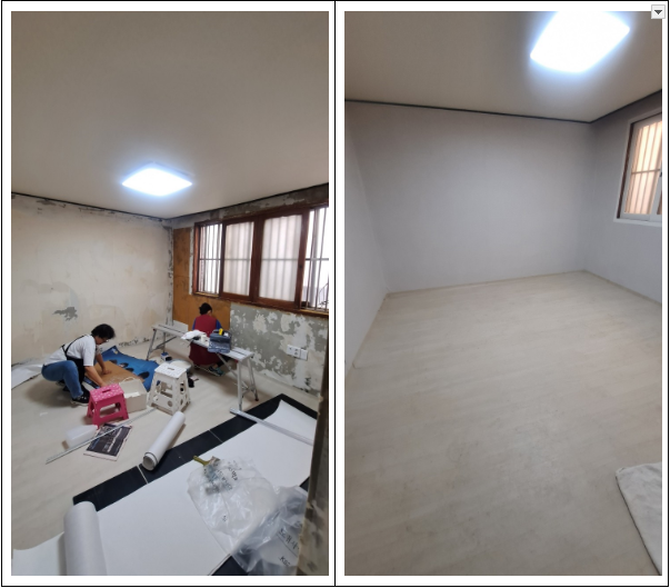 Worn flooring was replaced with new vinyl to improve comfort and reduce daily inconvenience. Damaged walls were finished with tile to strengthen hygiene and durability. Doors were refinished with protective film to create a cleaner, brighter atmosphere, while fresh wallpaper brought warmth and renewed life to the entire space.